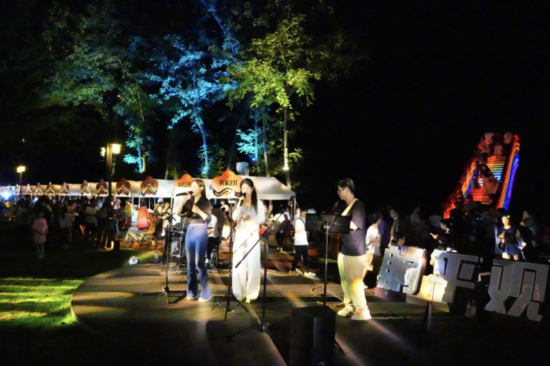 无需购票,也无须预约,人们或并排坐于长椅,或席地而坐,在秋夜微凉的晚风中,轻松融入这片开放的音乐空间。本次街演邀请了佳禾演艺、木头吉他屋等本地知名团队,为现场观众带来了丰富多彩的乐队及歌手演唱。然而,活动最大的亮点在于其开放的舞台模式——不仅有歌手献唱,更专门设置了“游客点唱”环节,邀请观众走上舞台,在专业乐队的伴奏下一展歌喉,真正让游客成为夜晚的主角。