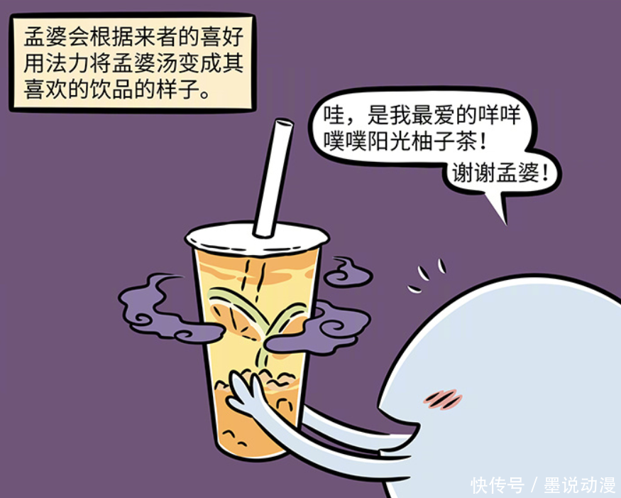 孟婆顺应时代发展,根据来者的喜好,用法力将孟婆汤变成他们喜欢的样子。比如将孟婆汤变成柚子茶,这样会让这些魂魄更能接受,也就可以顺利喝下去。这款噗噗阳光柚子茶,似乎在之前出现过,该魂魄也很感谢孟婆。